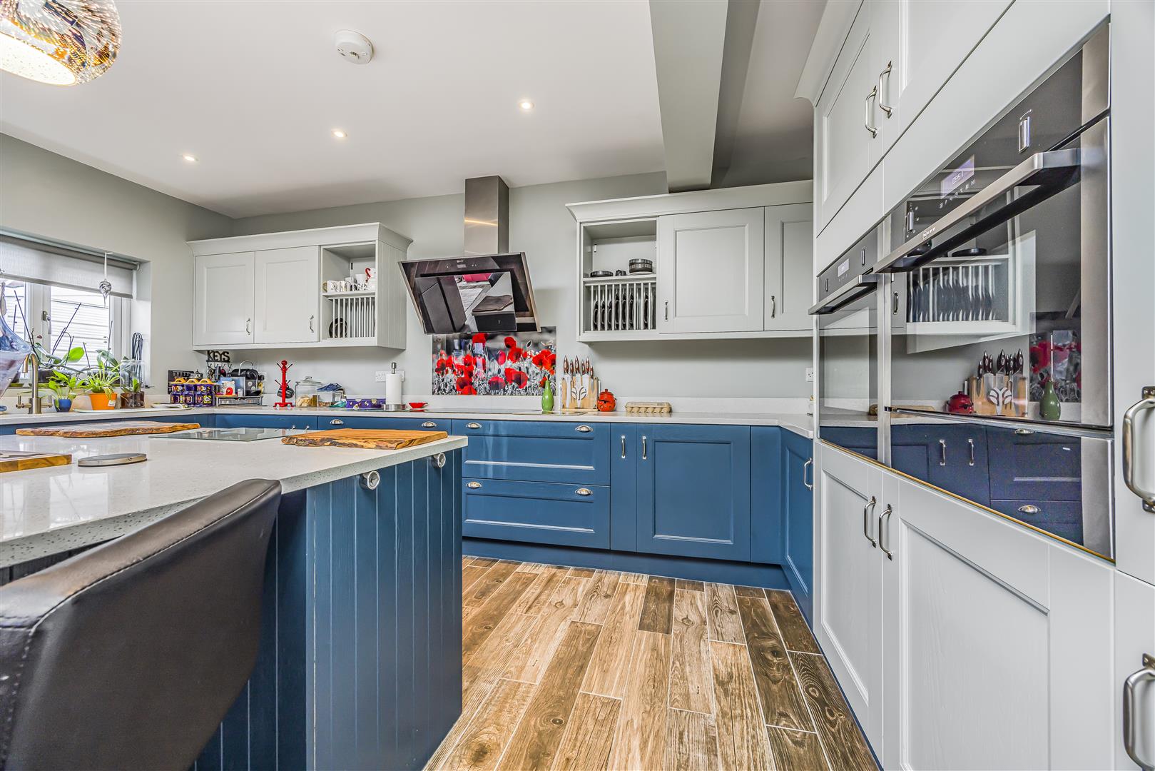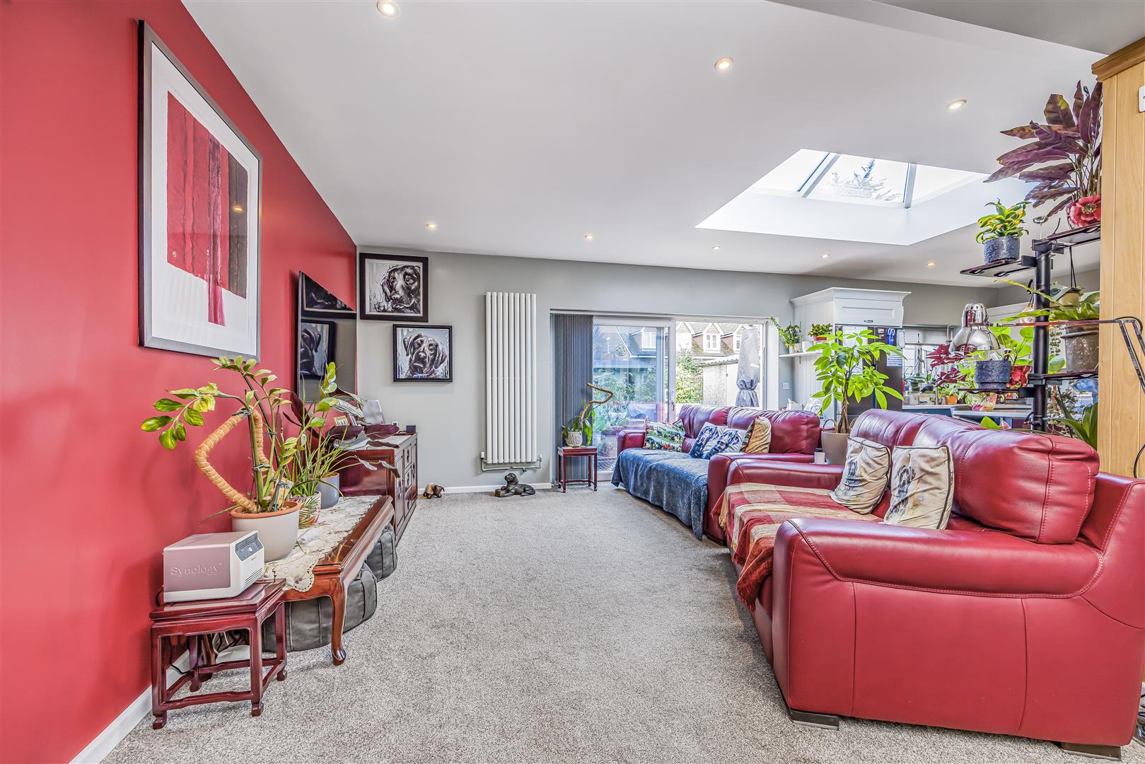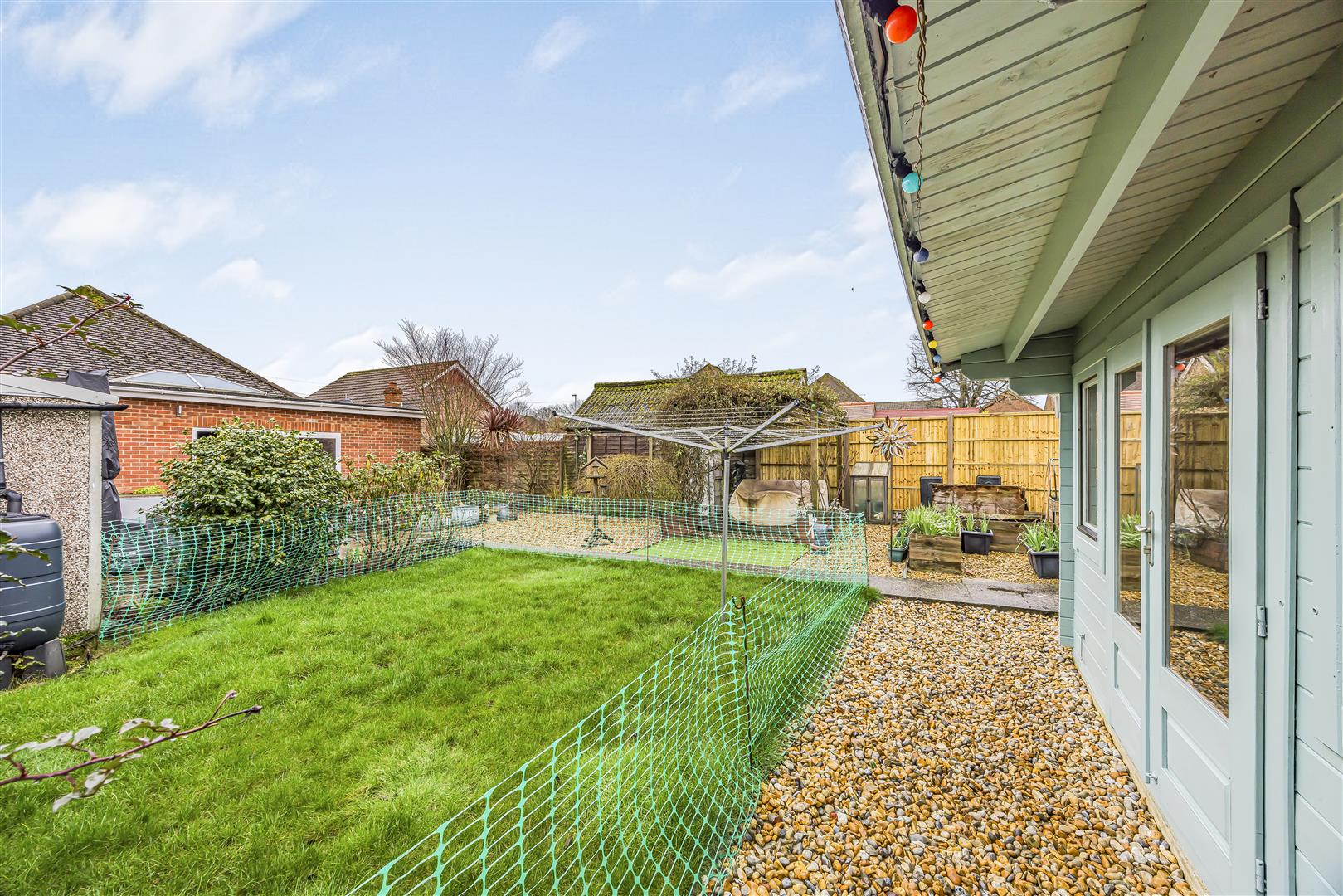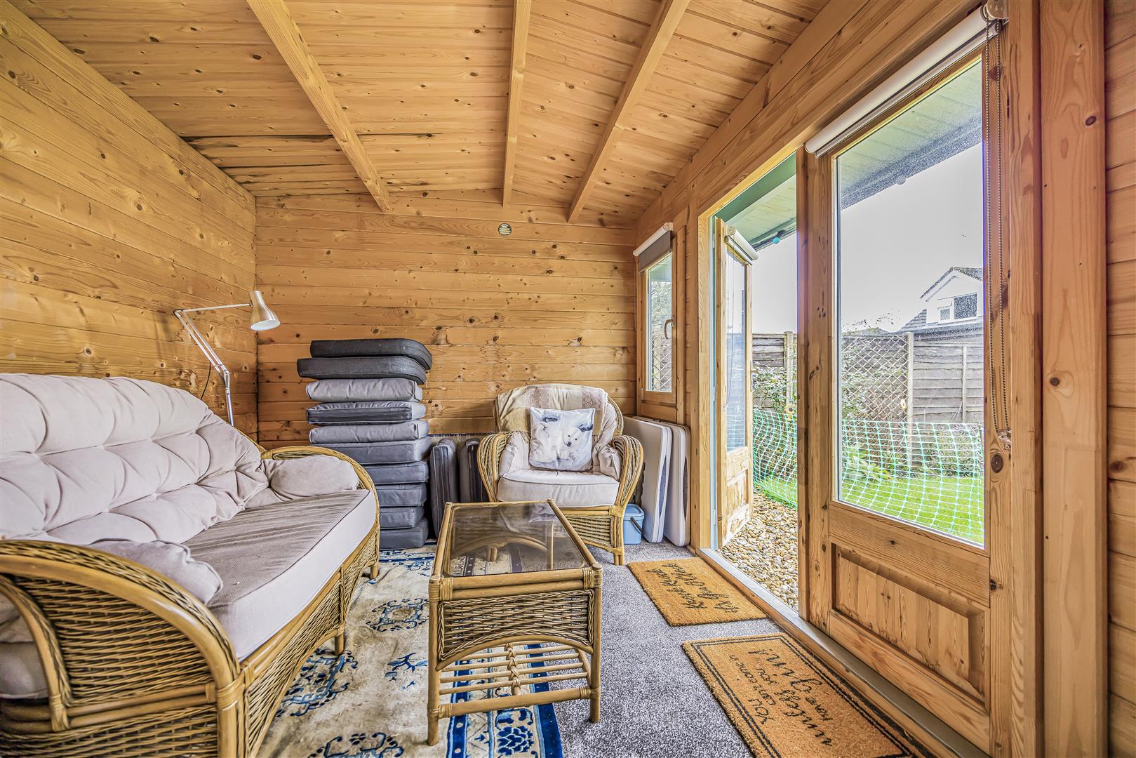 Flowing naturally from these spaces is the modern kitchen, centred around a stylish island with seating that provides additional stone worktop space and a casual dining option. Skylights and rear doors allow natural light to flood the room and provide easy access to the garden, seamlessly extending the living space outdoors. Stepping outside into the garden, the space has been thoughtfully arranged to offer a variety of areas. A patio area provides a comfortable seating space ideal for outdoor dining and entertaining, while the garden also features a pond, adding a peaceful focal point. The garden continues with a mix of stone and lawn areas, creating both low-maintenance sections and open green space suitable for family use. Well-kept planting beds add colour and character throughout, while a summer house at the end of the garden provides a versatile additional space, perfect for relaxing, hobbies, or entertaining during the warmer months.